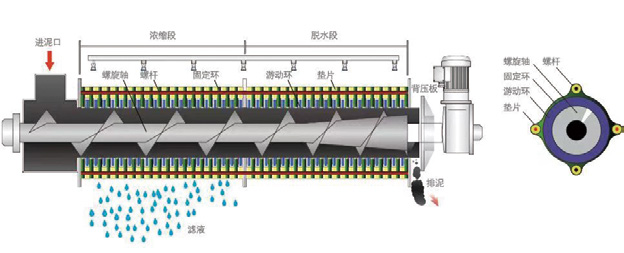 叠螺式污泥脱水机是一种设计紧凑占地空间小,低耗能、低运行费用、 高节能、高技术含量、便于维修及更换、重量小、便于搬运的设备。尤其 适合中小型污水厂、乡镇污水厂、污水处理站。该脱水机以独特微妙的滤 体模式取代了传统的滤布和离心的过滤方式,降低投资成本,提高处理效率。